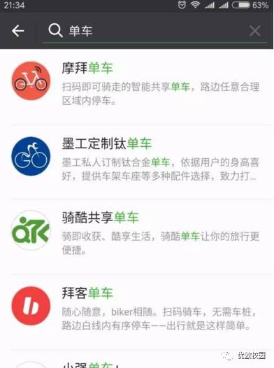 微信小程序和标题和描述一定要包含品牌词或核心关键词,比如我们在微信小程序搜索关键词:单车,结果如下图:摩拜单车是单车领域最早开通小程序的,所以排在了第一个。